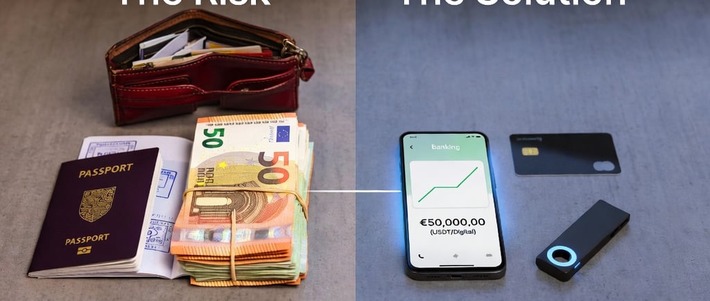 Pronto. O dinheiro agora está na "nuvem", fora do alcance da polícia europeia e da imigração. Você viaja leve.