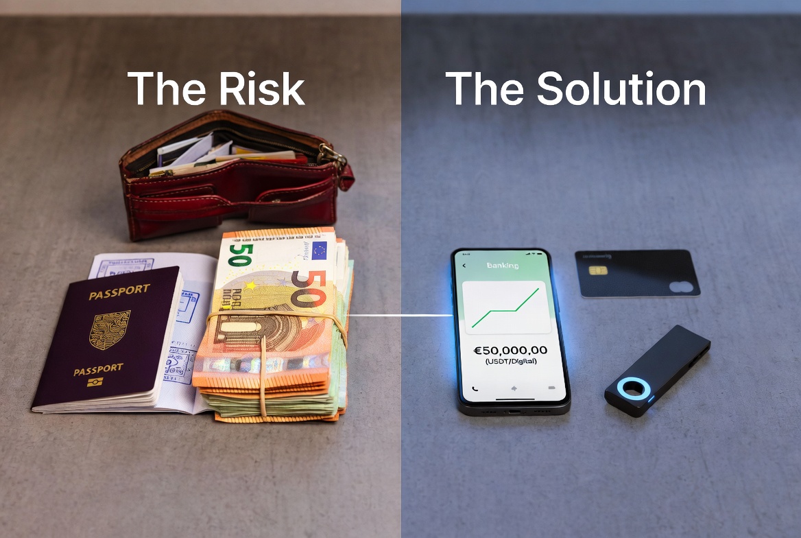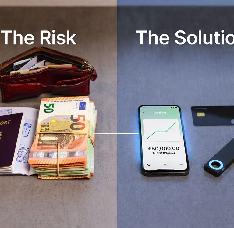 Você tem papel (Euro/Franco) e precisa de dígitos na conta do Brasil. Os bancos tradicionais (Western Union, Wise) são perigosos para grandes volumes em espécie, pois exigem comprovante de origem ("Source of Funds").