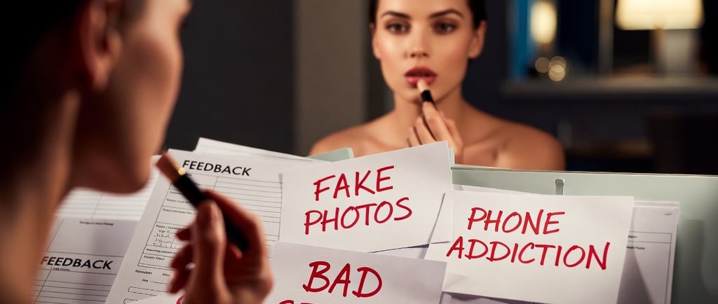 A cinematic, editorial-style close-up photography shot. In the foreground, a messy pile of handwritten feedback forms or charts on a luxury hotel desk. Some words are visible in red marker: "FAKE PHOTOS", "BAD SERVICE", "PHONE ADDICTION". In the background, slightly blurred, a beautiful woman is looking at her reflection in a mirror, fixing her lipstick, oblivious to the feedback on the table. The lighting is dramatic, focusing on the papers. The vibe is: "The harsh truth behind the beauty."